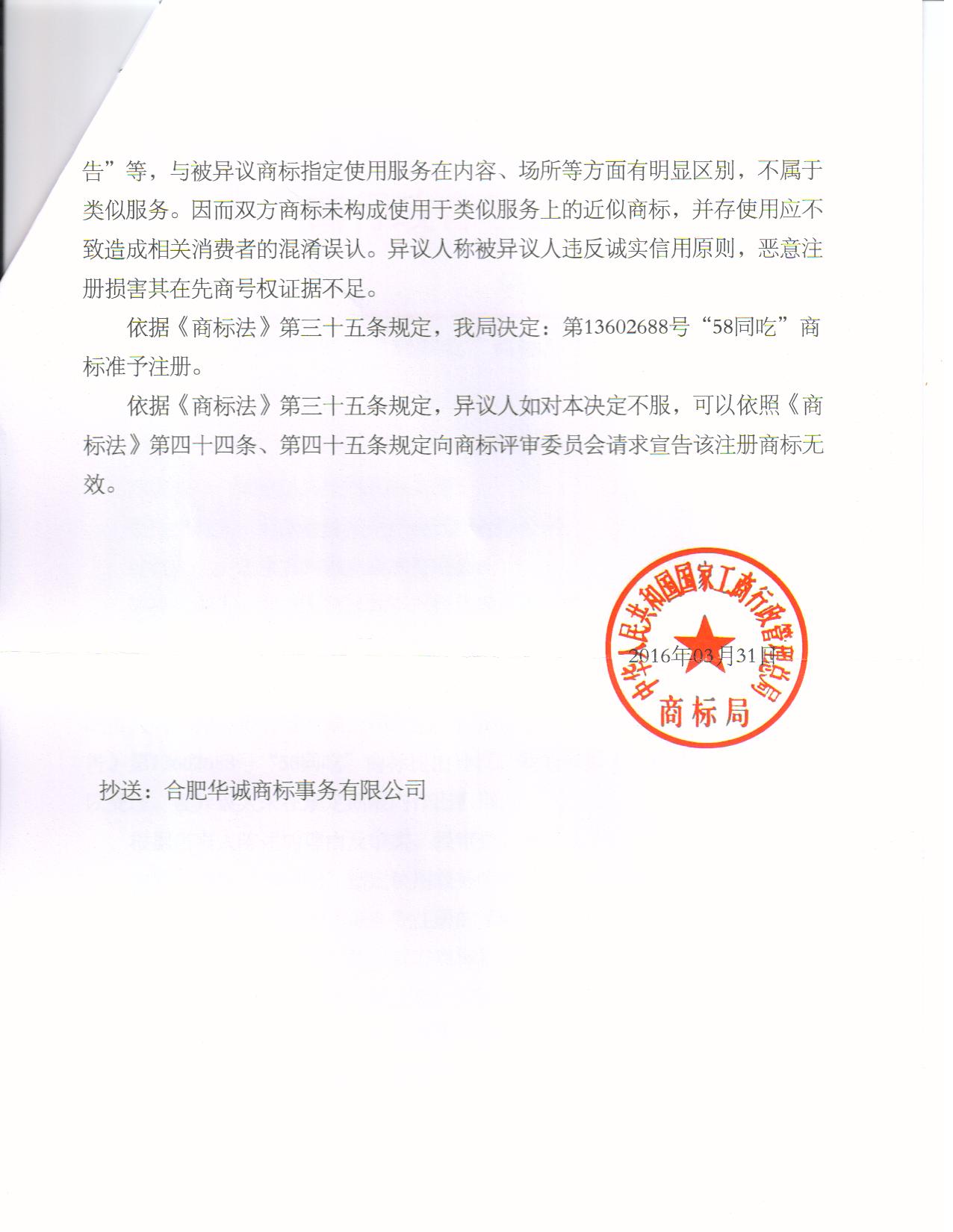 "58同吃”商标准予注册的决定