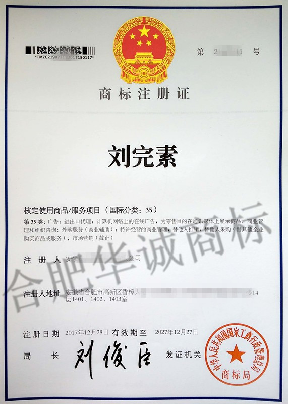您委托我所代理商标注册申请,名称为“刘完素” 35类商标注册证已下达。