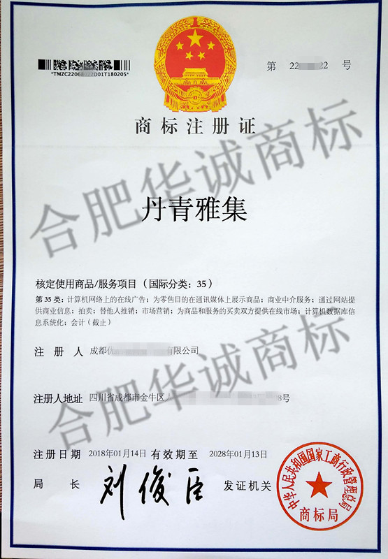 您委托我所代理商标注册申请,名称为“丹青雅集” 35类商标注册证已下达。