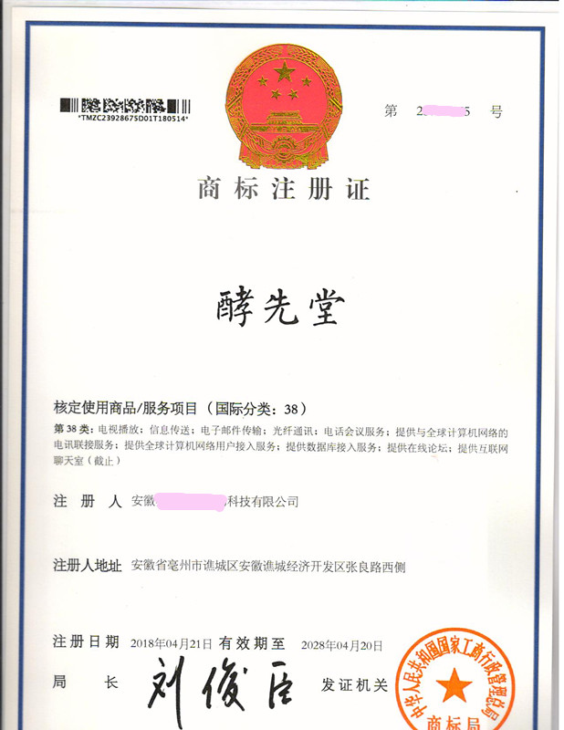 您委托我所代理商标注册申请,名称为“酵先堂”38类商标注册证已下达。