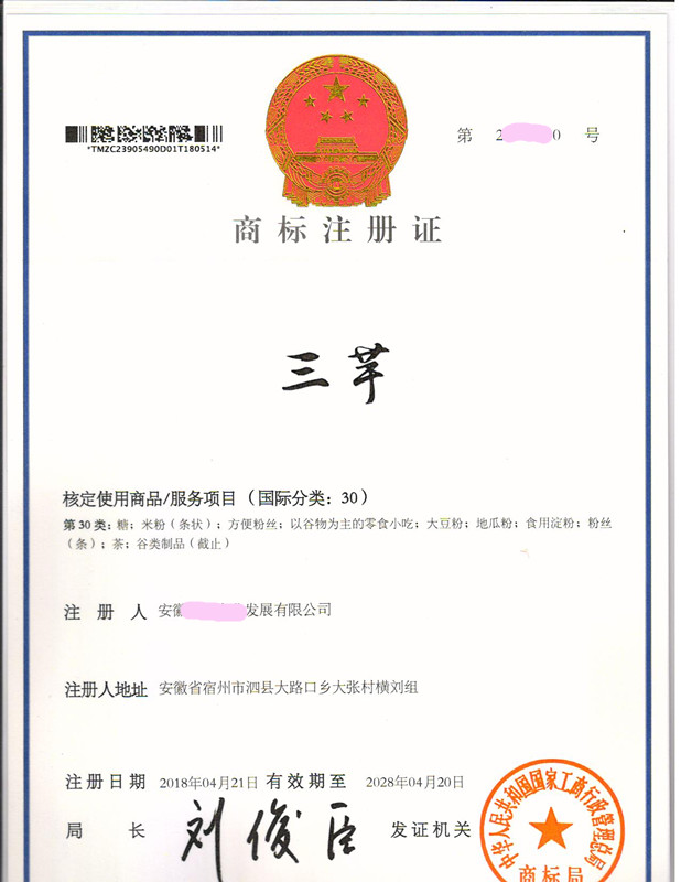 “三芋”30类商标注册证下达