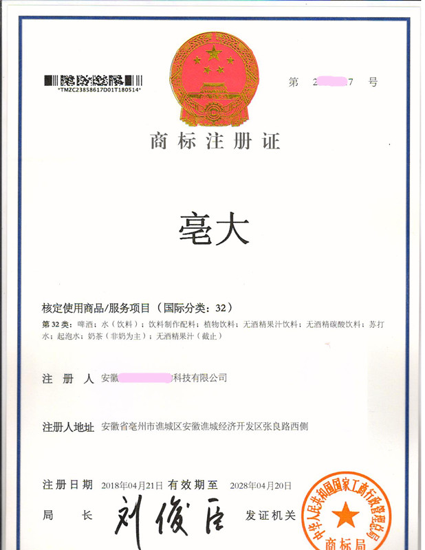 您委托我所代理商标注册申请,名称为“亳大”32类商标注册证已下达。