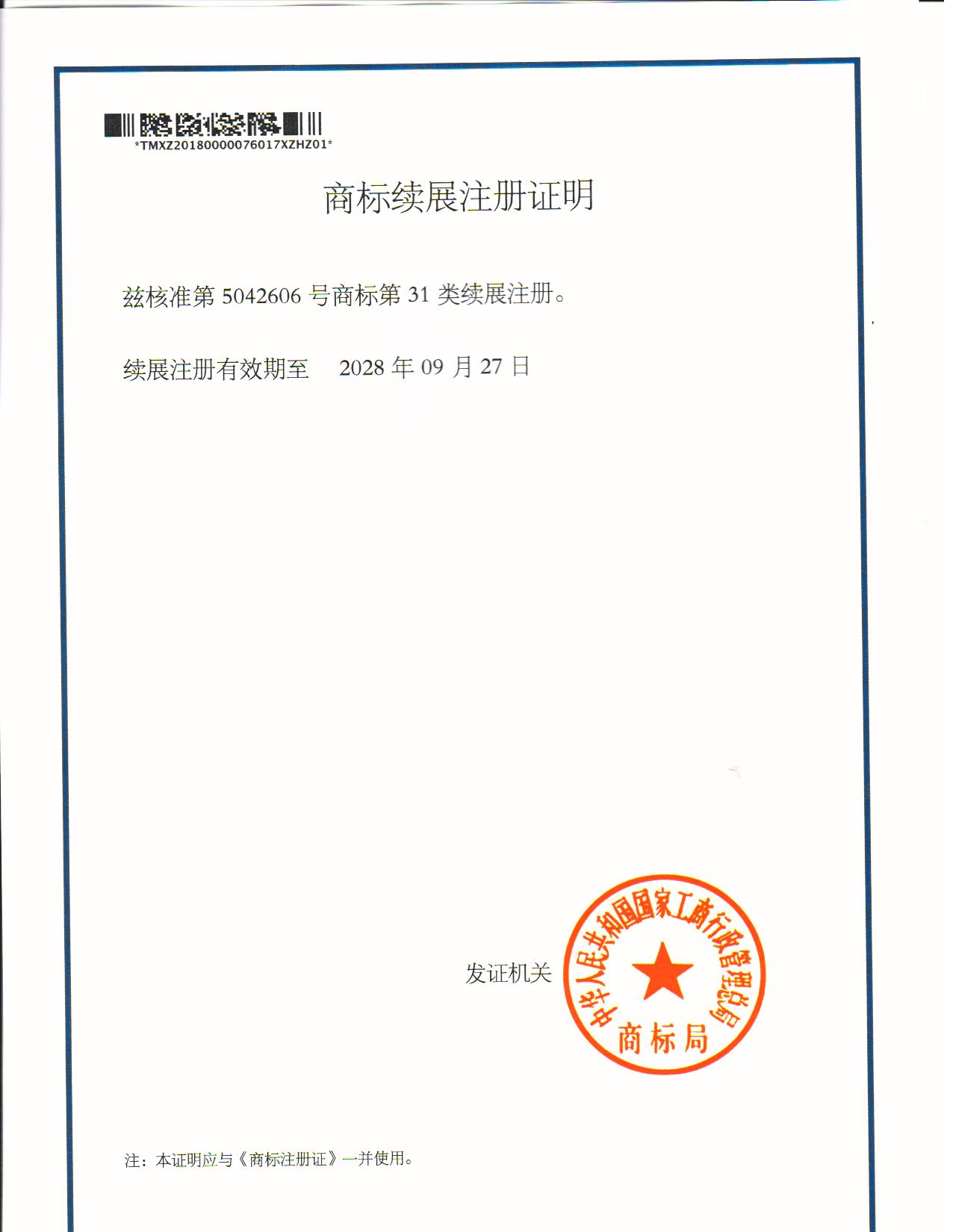 您委托我所代理商标注册申请,第“5042606”31类商标续展注册证明已下达。